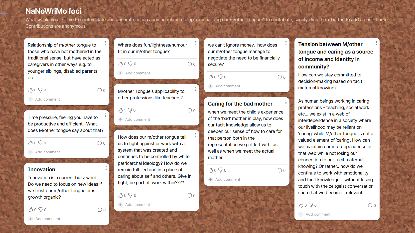 I am hoping, and also wondering, whether enough nuggets of the m/otherland can join up. The fiction may continue to tell me how this might happen as I attempt to deduce a theory that supports us to work through our m/other tongue. In constructing theory, I hope to create a place where voices can gather, strong enough together to shape the practice of care. I hope that enough of us can take up such theory that it becomes less of a fringe idea and more of a mainstream one.